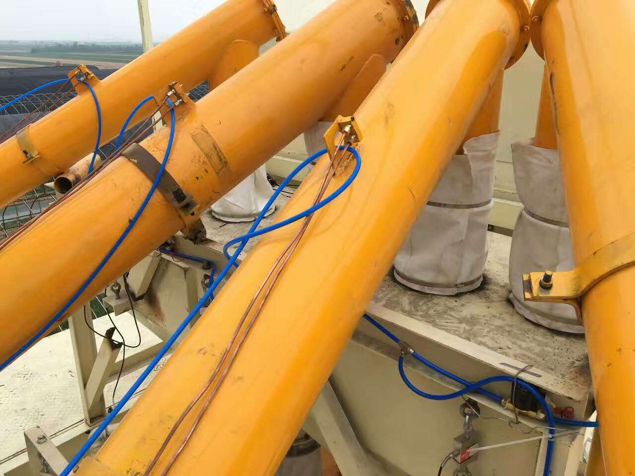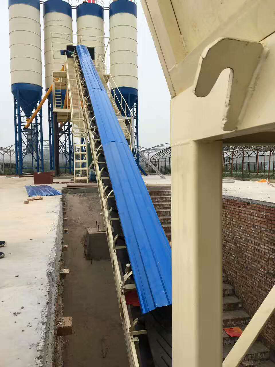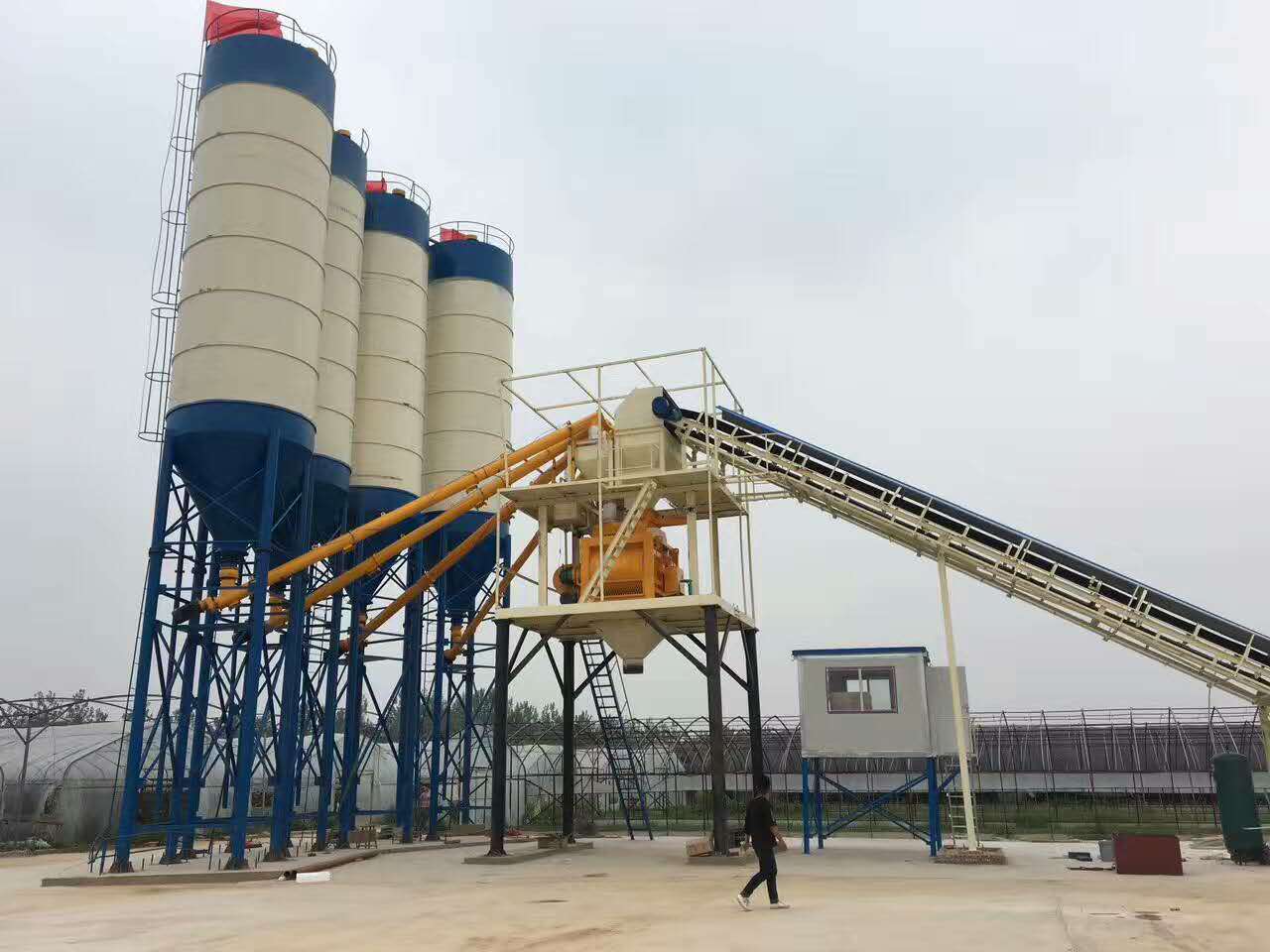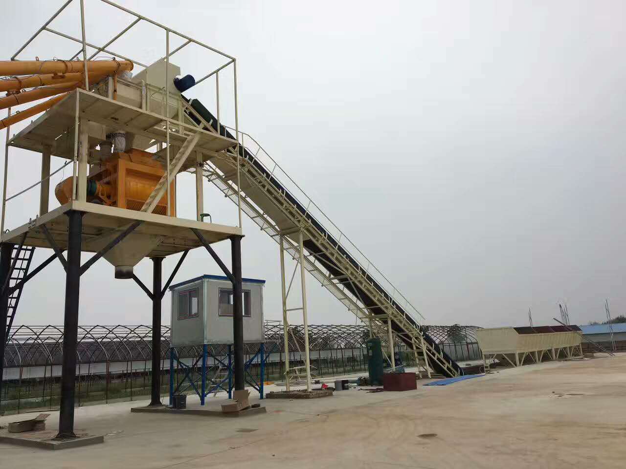 整套攪拌站在一片寬闊的水泥地面上安裝,水泥倉,攪拌主機,配料機,控制室,輸送裝置,料斗,從西到東,整排下來,一氣呵成,顯得干凈利索毫不拖沓。