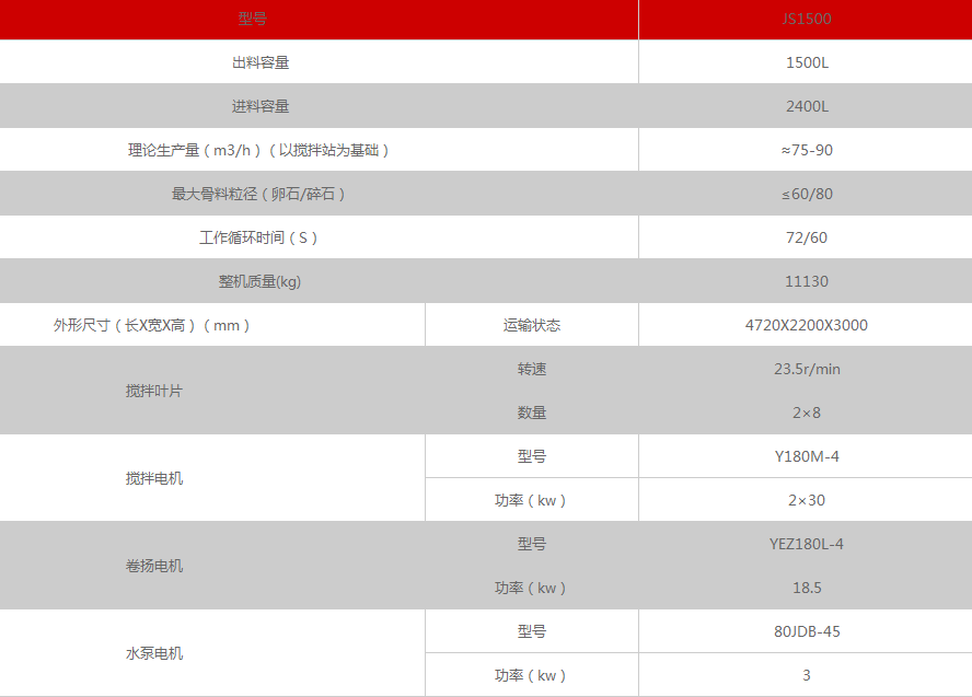 JS1500可分為擺線針式減速機和行星式減速機兩種。支腿部分高度設計為:2.7米支腿高度和3.8米出料高度。用戶可自行配備翻斗車、自卸車、攪拌車使用,同時還可根據(jù)用戶特殊要求進行改制,以滿足用戶需要。