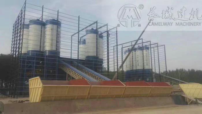 與工程攪拌站比較,標(biāo)準(zhǔn)攪拌站中增加了斜皮帶機(jī)和等待料倉。在主機(jī)攪拌的同時,把配料機(jī)配送好的料傳送入等待料倉,等待攪拌??s短了提升時間,提高了生產(chǎn)效率。