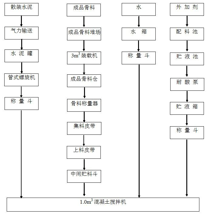 C、啟動砂、石進料到計量斗;打開粉煤灰、水泥罐的蝶閥,啟動螺旋機電機輸送粉煤灰、水泥到計量斗;開啟水倉和外加劑池的控制閥使水和外加劑流入計量斗。
